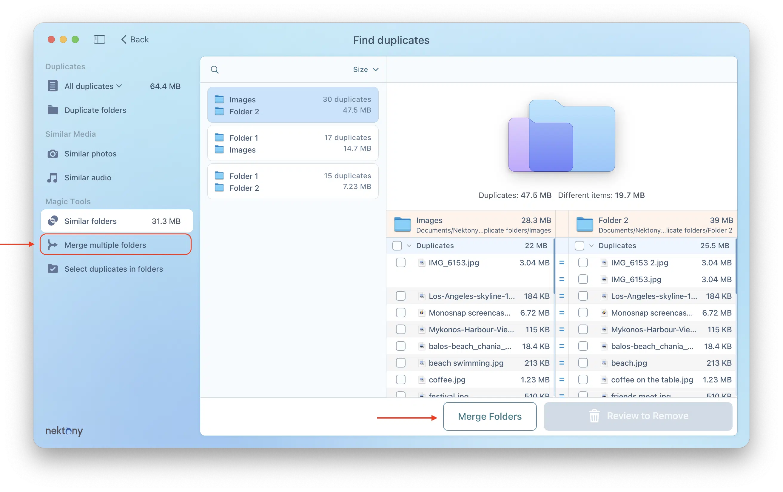 Switch to the Similar Folders tab and click the Merge Folders button, or directly go to the Merge Folders section.