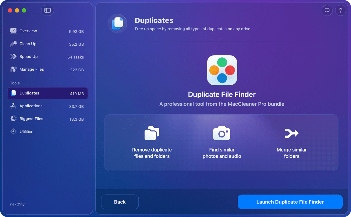 This section helps you locate and delete duplicate files scattered across your Mac, allowing you to quickly free up hundreds of megabytes or even gigabytes of space.