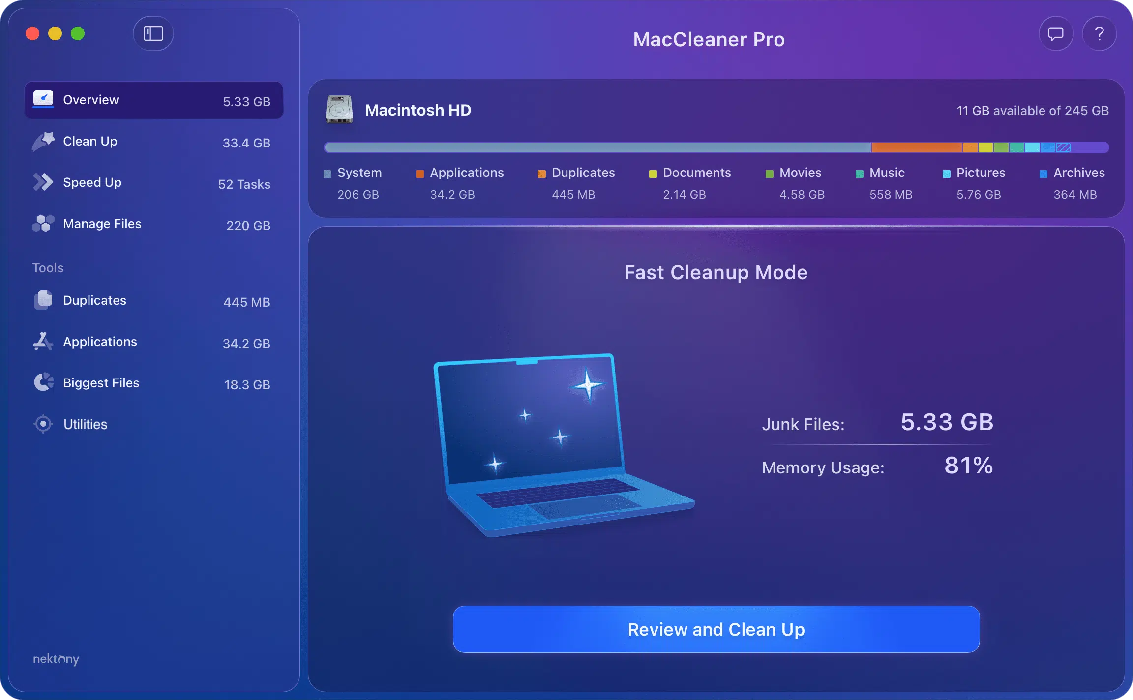 MacCleaner PRO is an all-in-one software solution to free up space on your Mac and make it always run like a new computer. The program provides a clean and simple user interface. Also, the program comes with additional Pro tools for a deep Mac cleanup.