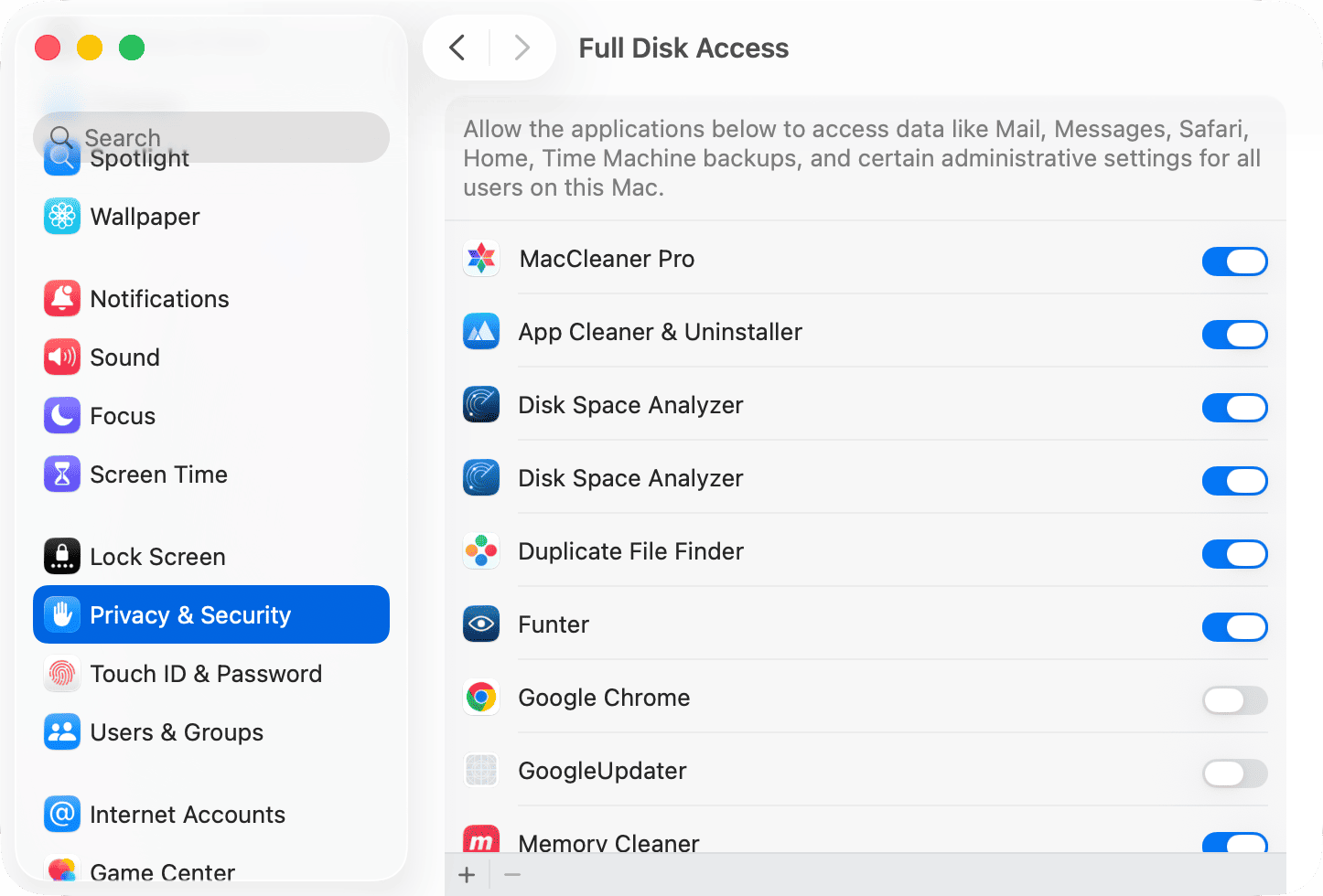 Click Open System Settings → in the Full Disk Access list, toggle on MacCleaner Pro.