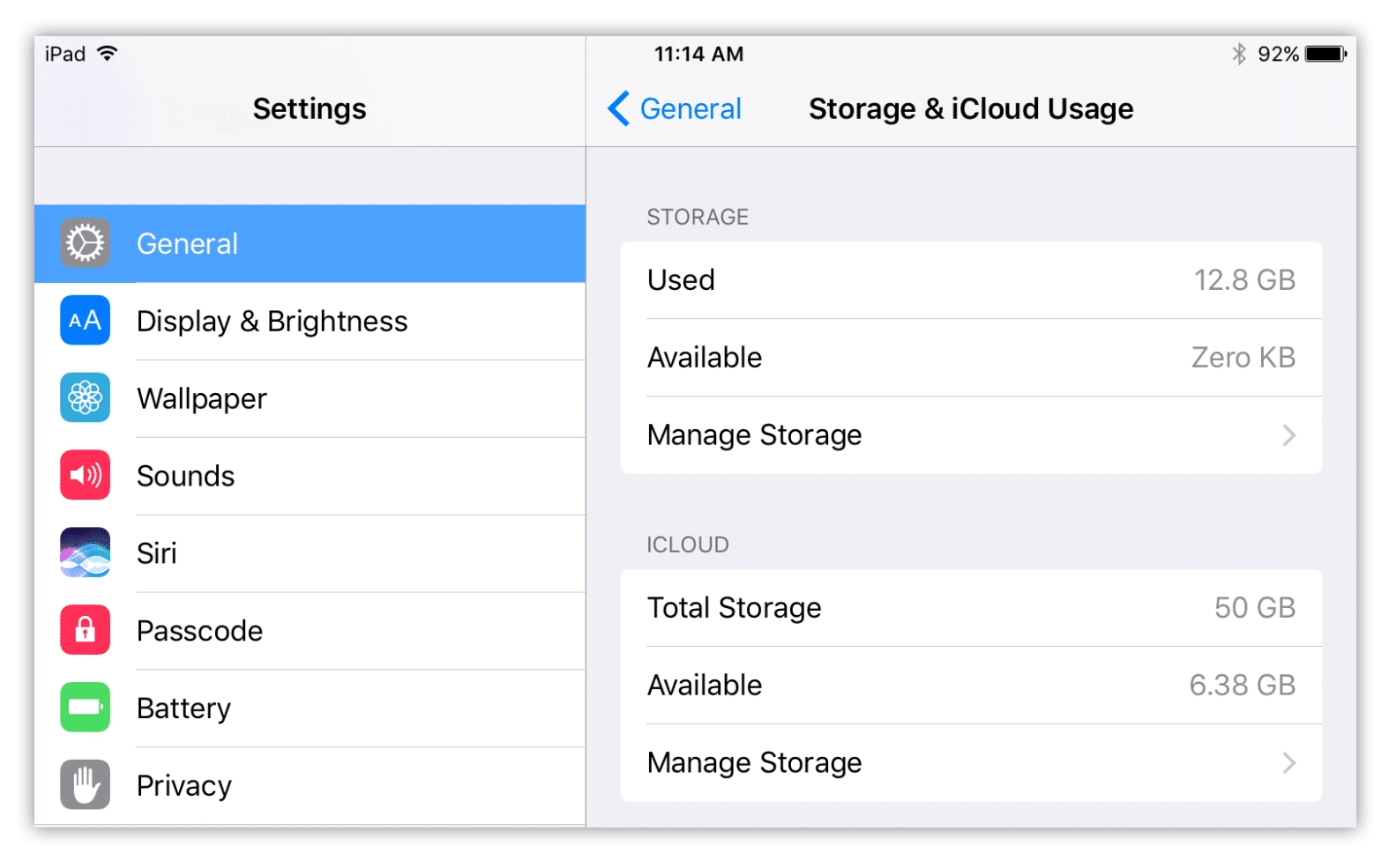 First, let’s check your iPad’s total usage. For this, go to Settings → General → Storage and iCloud Usage. There are two sections: Storage and iCloud. Your iCloud storage is sharing between all your Apple devices. So, pay your attention to the local storage.